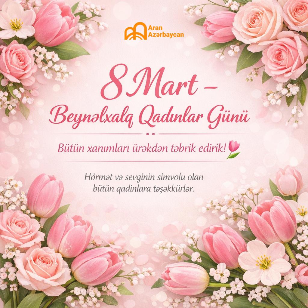“Aran Azərbaycan” MMC kollektivi olaraq, sizi zərifliyin, gözəlliyin və yeni başlanğıcların rəmzi olan 8 Mart – Beynəlxalq Qadınlar Günü münasibətilə ürəkdən təbrik edirik!